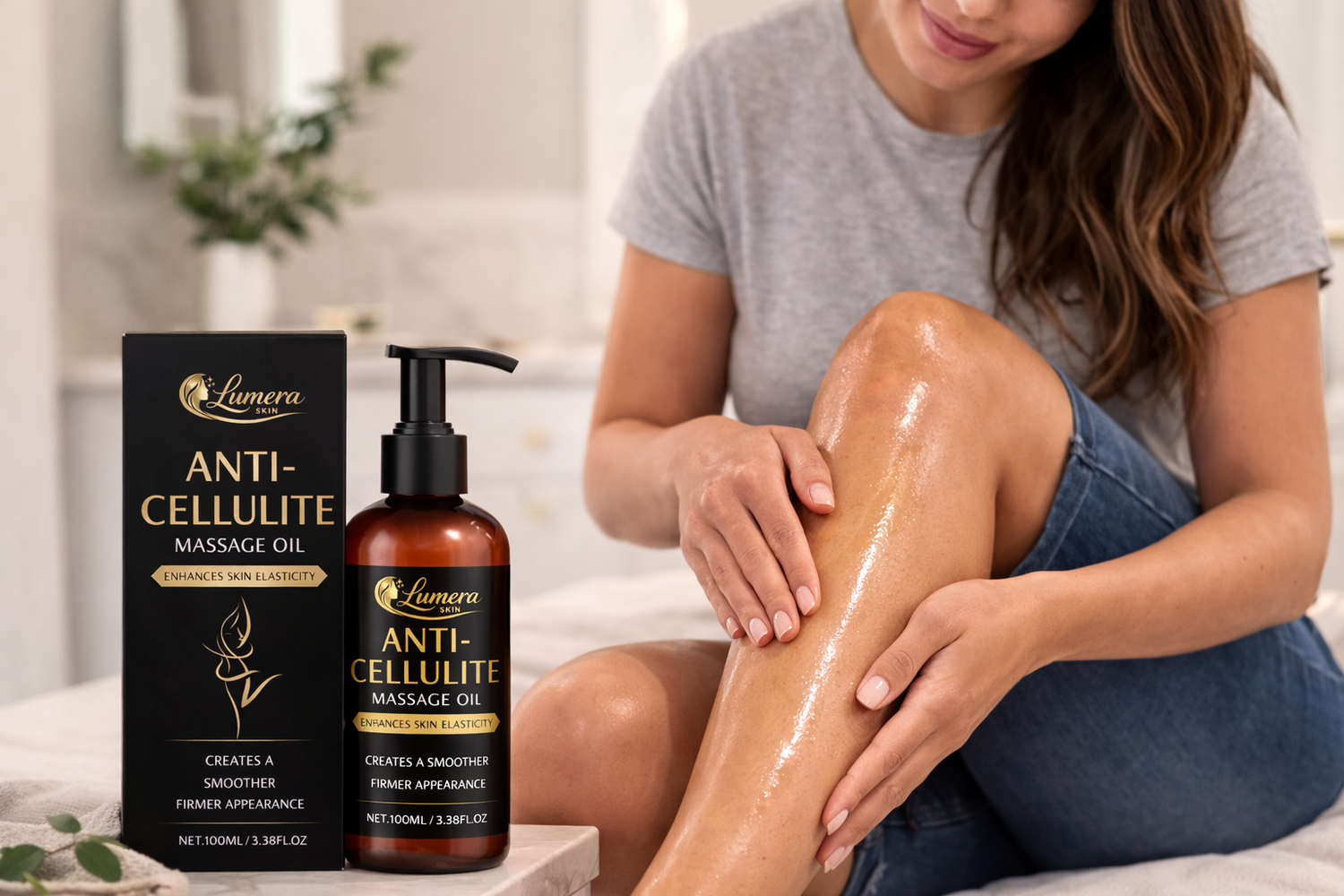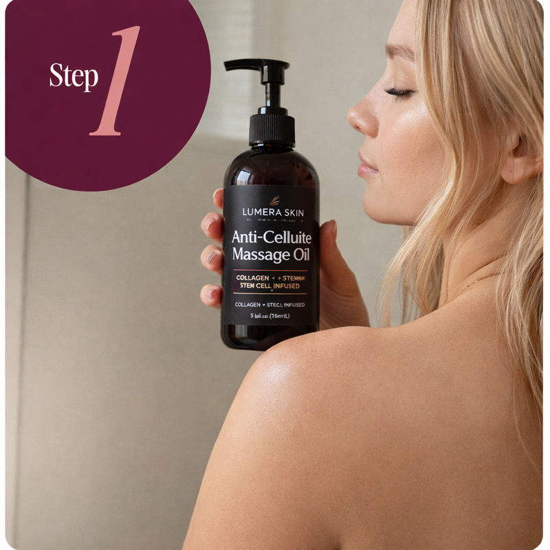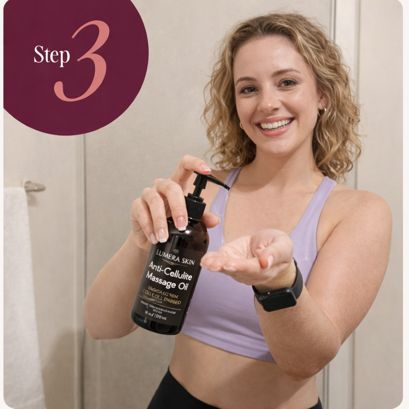 Step 1: Apply Lemura Skin Anti-Cellulite Massage Oil immediately after showering